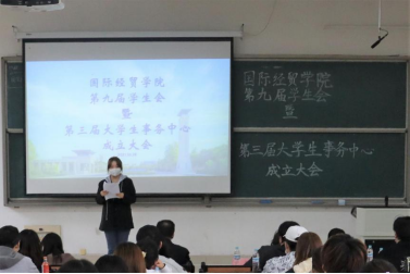 首先,大会由学生会代表聂陈卓杰同学发言,她向我们介绍了学生会部门和分工工作,总结了过去一年中,学生会组织的各类文娱活动,如帮助同学们深入了解职场礼仪的“悦享青春,绽放国贸”商务礼仪大赛,展示三千计划成果的“实践归来话感受”三千计划宣讲会及“五四”文艺汇演、红色定向越野等,同时,聂陈卓杰同学也代表学生会做出郑重承诺,学生会将继续奋发进取为学院师生贡献力量。