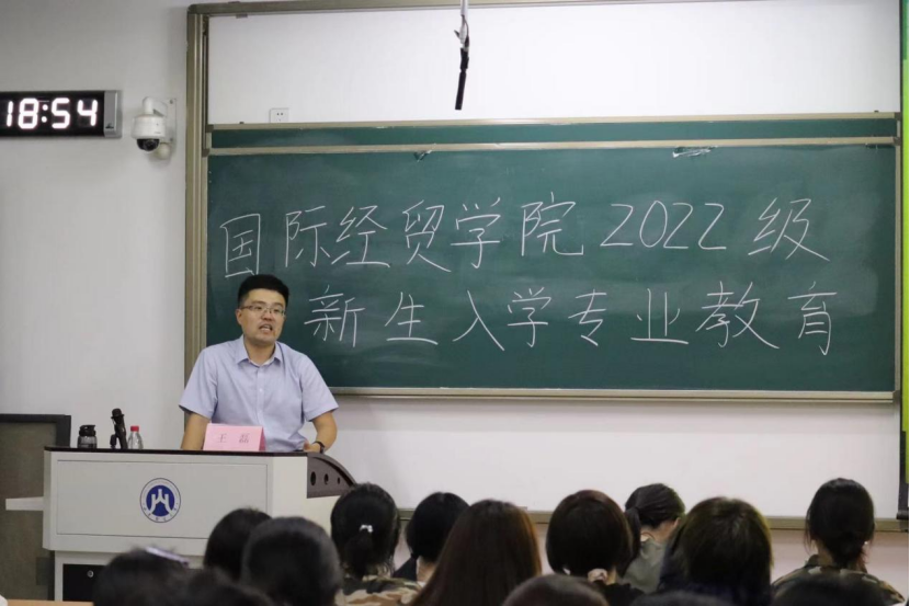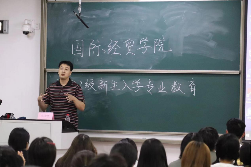 副院长刘伟全老师,院长助理王磊老师、国际商务教研室王涛老师、李大凯老师,于9月26日晚在圣井校区6号楼为全体新生举办入学专业教育讲座。