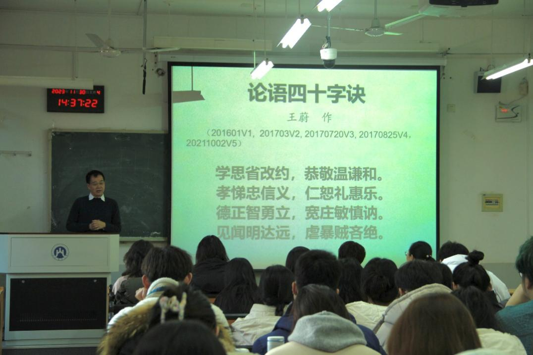 王蔚教授就对《论语》的研究体会总结出论语四十字诀:“学思省改约,恭敬温谦和。孝悌忠信义,仁恕礼惠乐。德正智勇立,宽庄敏慎讷。见闻明达远,虐暴贼吝绝”。王教授带领同学们朗读并背诵了四十字诀,希望同学们能够学会其中修身处世的道理。