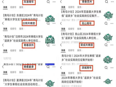 部分地区会通过团委公众号发布“青鸟计划”的推文,同学们可以多多关注当地地方团委公众号,积极报名参加寒暑假“青鸟计划”的实习实践活动。