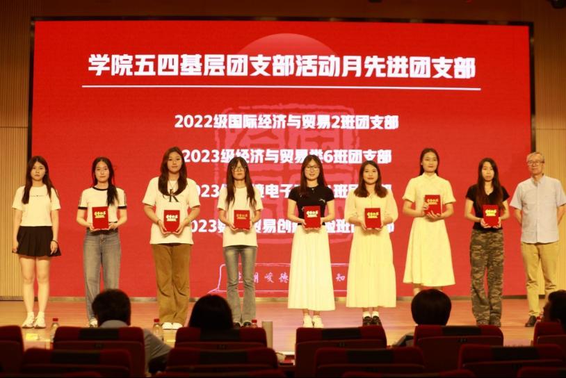 团支部的凝聚力和团员青年的青春活力。比赛在经济与贸易类五班团支部表演的戏剧合唱《忆过往峥嵘,寻未来光亮》中拉开帷幕,节目创新性地采用影子戏的形式刻画了近代中国青年在黑暗中探索前行,寻求救国真理的光辉事迹。国际经济发展合作班团支部表演的话剧《我见青山》演绎了当代青年次仁阿登努力践行“到西部去,到祖国需要的地方去”的青春誓言。数字贸易试验班团支部带来的歌舞《白日梦想家——青春歌舞秀》,充分展示了国贸青年的活力与朝气,将晚会的气氛推向高潮。经济与贸易类一班团支部表演的话剧《回望》以青年沈泽民的视角向我们展示了革命先驱舍生取义的牺牲精神。经济与贸易类二班团支部表演的合唱《有我》用嘹亮的歌声唱响了国贸学子勇挑时代重担的铮铮誓言。比赛在经济与贸易类三班团支部表演的话剧《破晓》中缓缓落下帷幕。