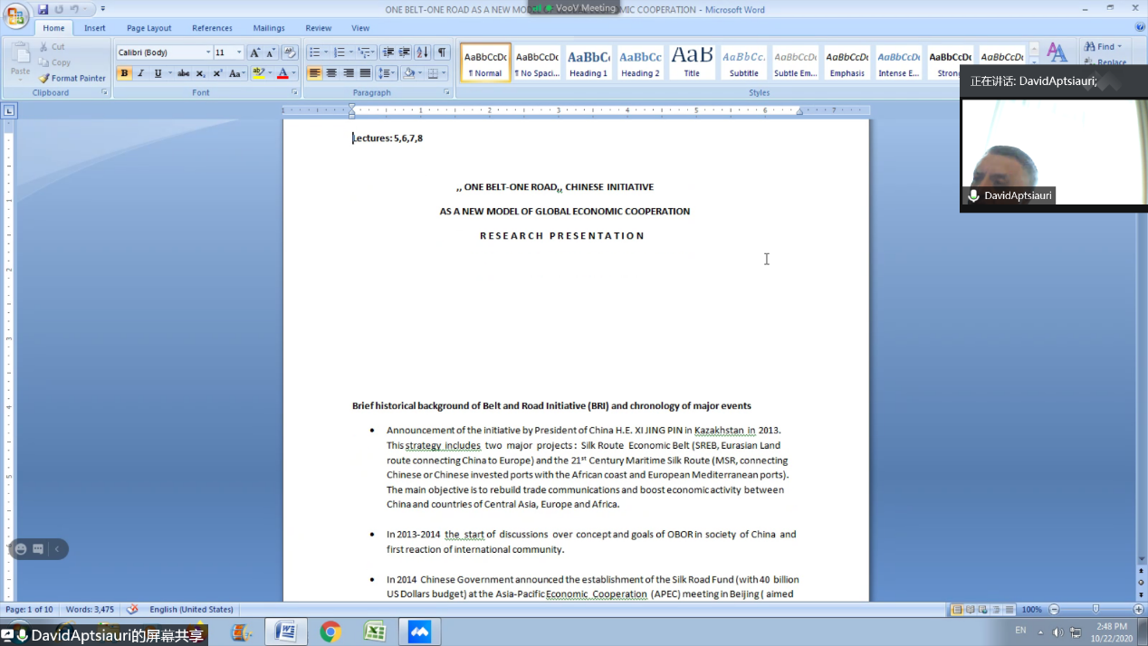 整个学期的“国际发展合作”课程以“现代国际经济关系发展的新趋势和日益增强的国际合作作用”为主题,分别从现代经济关系和经济外交的定义和主要方向、现代国际经济关系发展的新趋势和新过程、新冠肺炎疫情危机对世界经济的影响、中国“一带一路”倡议视野下的经济外交及其在促进国际发展中的作用、东西方合作发展的新视野和新战略、现代国际发展与合作政策的基本原则和主要方向、国际组织在国际发展与合作政策中的作用、文化在国际发展与合作活动中的作用等方面进行讲授。课程内容方面,大卫教授充分将理论背景与现实案例结合起来,以分主题报告的形式向同学们系统性的阐述了现代国际经济关系与国际发展合作的知识框架,课程内容全面深入,课堂讲授观点新颖,极大地丰富了同学们的专业知识储备,提升了学习兴趣。