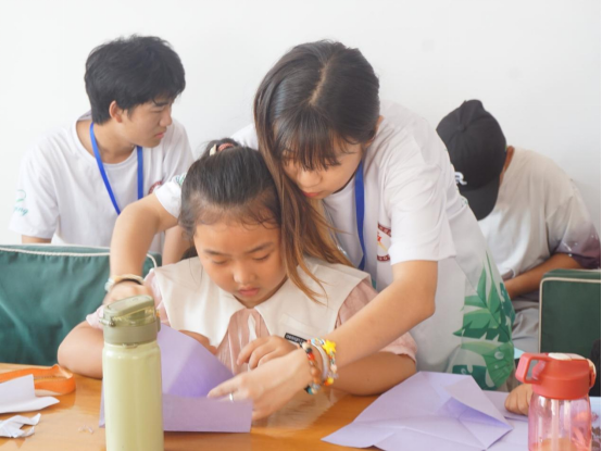 图为手工课上,支教组成员耐心指导小朋友们做手工