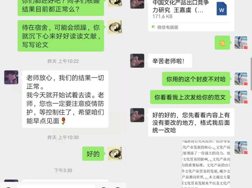 一句“你们随时联系我就行”,让他们成为了学生眼里的“守护者”,一句“如果需要聊一聊,可以找我啊”,让他们成为了学生心中的“避风港”。很多老师都意识到,新冠疫情让每位同学都有些忙乱、焦虑和恐慌,要在迎接线上教学新挑战的同时,帮助学生在疫情防控期间做好心理建设。老师们在承担教学任务的同时,还肩负起学生心理辅导的任务,通过各种方式传播防疫正能量,提高学生心理调适能力、互助能力,缓解学生心理压力,将“担当、责任、坚韧、勇敢……”灌输于每位同学,做好学生的依靠和港湾。