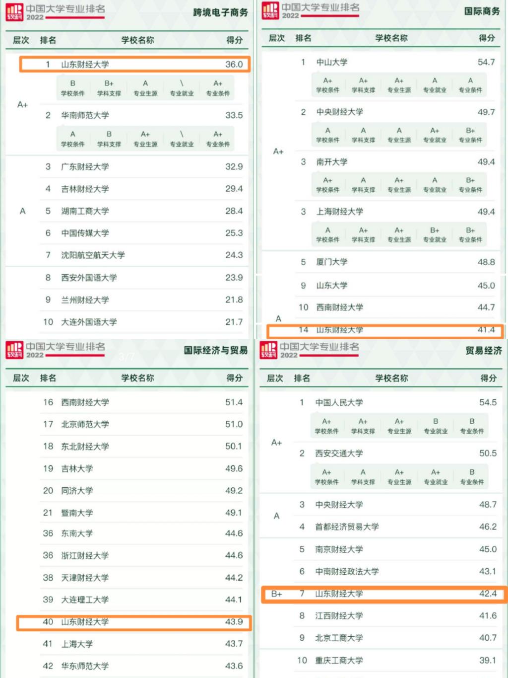 跨境电子商务、国际商务、国际经济与贸易、贸易经济四个专业上榜。跨境电子商务专业全国高校排名第1名,评定等级为A+;国际商务专业全国高校排名第14名,山东高校排名第2位,评定等级为A;国际经济与贸易专业全国高校排名第40名,山东高校排名第2位,评定等级为A;贸易经济专业全国高校排名第7名,山东高校排名第1位,评定等级为B+。