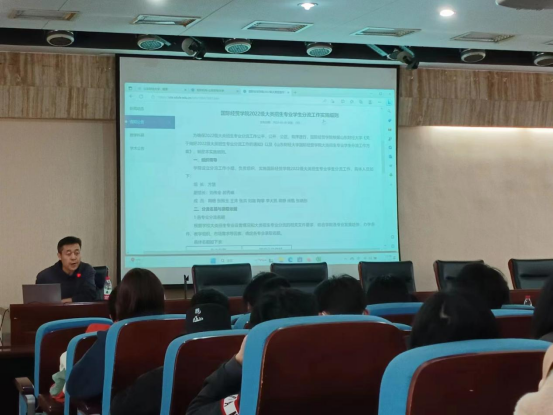 副院长刘伟全、党委副书记王斐斐、教师代表王涛、2020级辅导员李亚莉、2022级辅导员房甄出席本次会议,2022级经济与贸易类专业全体学生参加会议。
