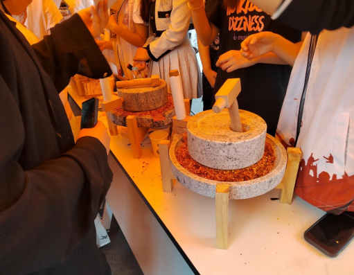 石磨磨制辣椒面,领略古人以发明石磨精进粮食加工的智慧成果,同学们挥臂研磨,用辛勤劳动换取属于自己的美味成果。