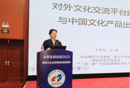 院长方慧教授受邀参加此次会议,并以《对外文化交流平台建设与中国文化产品出口》为题作主旨演讲。方慧教授基于中国文化产品出口的总体趋势、出口结构演变和出口区域分布,指出了目前中国文化产品出口存在的问题,详细介绍了对外文化交流平台情况,她认为,对外文化交流平台为文化产品出口带来的机遇,一是促进跨文化理解,减少“文化折扣”;二是增强社会信任,延长贸易联系持续期;促进内容创新,提升文化产品质量;四是数字文化交流打破时空局限,带来新的出口机会。