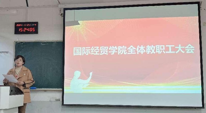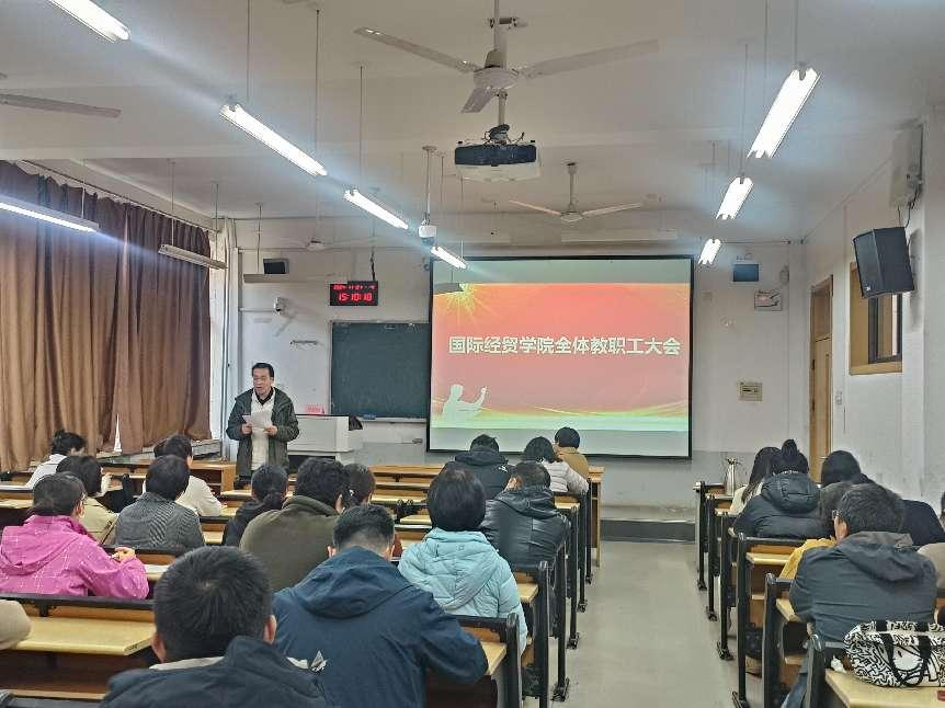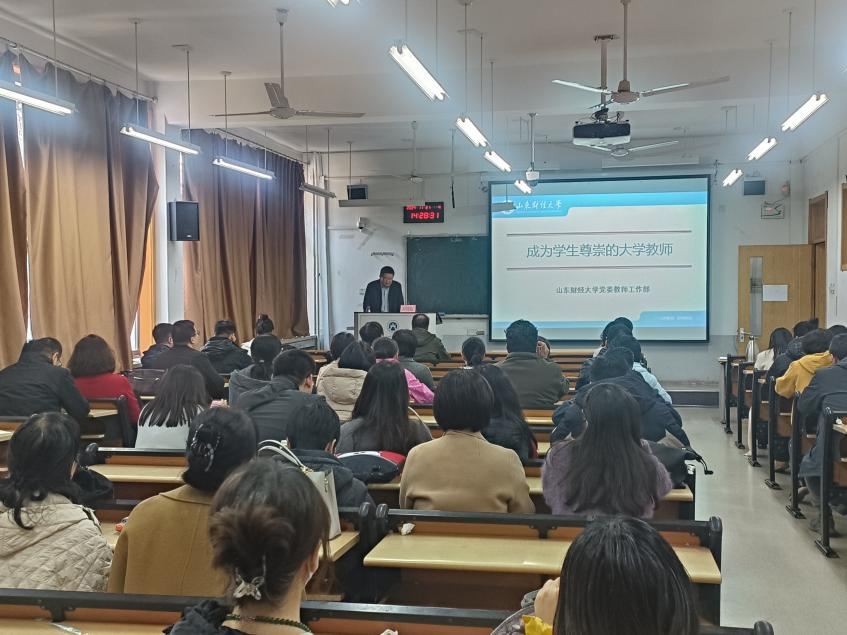 在舜耕校区召开全体教职工大会。会议邀请学校教师工作部部长刘国强担任师德师风专题主讲人。会议由学院党委书记崔东峰主持,学院党委副书记郝秀峰、王斐斐以及全体教职工参加会议。