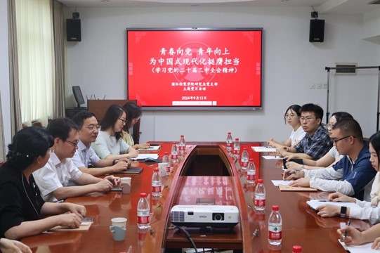 党支部书记王斐斐通过视频方式带领全体党员回顾了支部创建全国党建标杆党支部期间所作的工作及取得的成果,并通报了支部成功通过验收的喜讯。党员们围绕《中共中央关于进一步全面深化改革、推进中国式现代化的决定》中关于构建高水平社会主义市场经济体制、健全推动经济高质量发展机制体制、构建支持全面创新体制机制等一系列的重大改革举措和构建全国统一大市场、健全提升产业链供应链韧性和安全水平制度、实施自由贸易试验区提升战略、高质量共建“一带一路”等研究热点踊跃发言讨论,并谈了党员带头“领任务、做表率”所取得的科研成果。