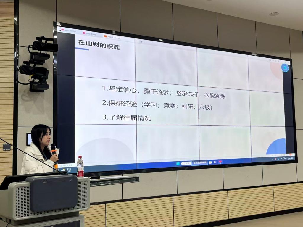孙田盈主要从三方面进行分享。在“山财积淀”部分,她鼓励学弟学妹坚定追梦,面对升学选择时要科学决策。同时强调学业成绩是保研“硬通货”,还要注重参加各类竞赛及英语能力的培养。
